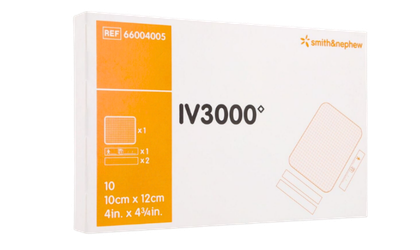 Pansement de fixation de cathéter IV3000 1-Hand™ de Smith & Nephew, format 10 cm x 12 cm, conçu pour une pose simple à une seule main. Stérile, transparent et respirant, il assure une fixation sécurisée et un suivi visuel continu du site d'insertion. Boîte de 10 unités.