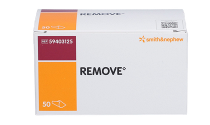 Dissolvant d'adhésifs médicaux REMOVE™ de Smith & Nephew®, conditionné en boîte de 50 unités. Formulé pour retirer efficacement et sans douleur les pansements, adhésifs et résidus de colle médicale, il protège l'intégrité cutanée et améliore le confort du patient lors des changements de pansement.
